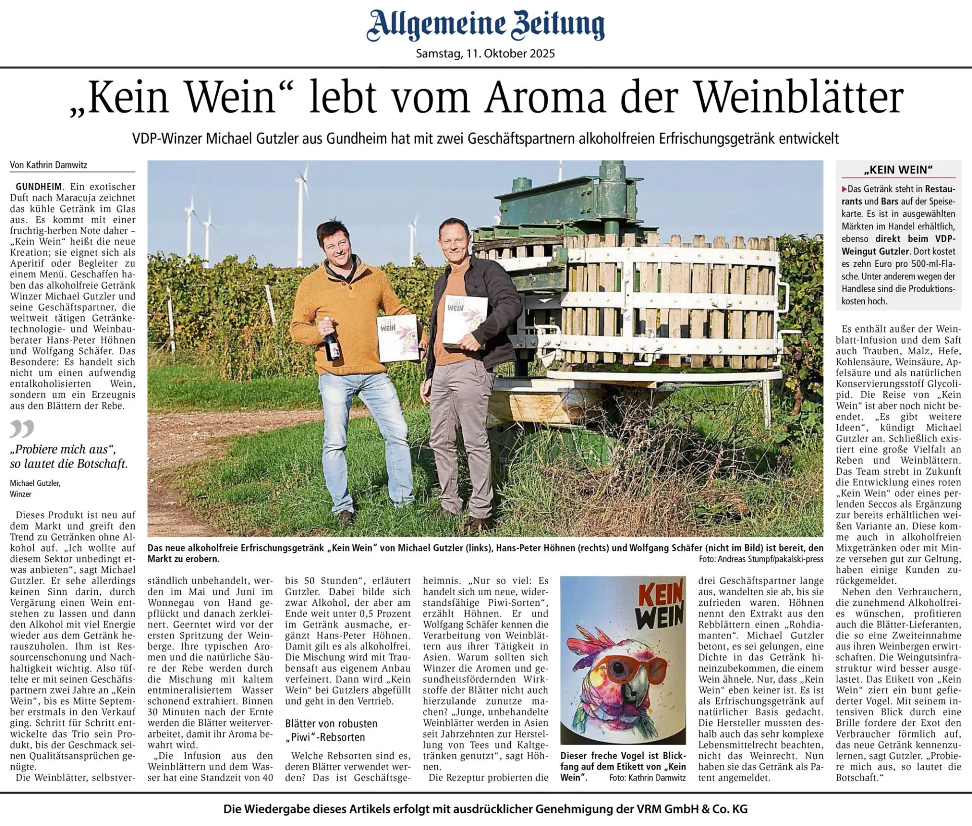 Ein exotischer Duft nach Maracuja zeichnet das kühle Getränk im Glas aus. Es kommt mit einer fruchtig-herben Note daher – „Kein Wein“ heißt die neue Kreation; sie eignet sich als Aperitif oder Begleiter zu einem Menü. Geschaffen haben das alkoholfreie Getränk Winzer Michael Gutzler und seine Geschäftspartner, die weltweit tätigen Getränketechnologie- und Weinbauberater Hans-Peter Höhnen und Wolfgang Schäfer…